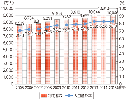 2015年末のインターネット利用者数2は、2014年末より28万人増加して1億46万人(前年比0.3%増)、人口普及率は83.0%となった(図表5-2-1-2)。